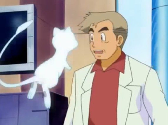 Oak rifiuta e un Mew, che era rimasto nascosto nelle vicinanze, vola vicino a lui.