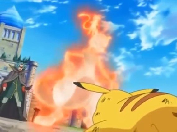 Il Team Rocket viene lanciato fuori dall’edificio da un Lanciafiamme di Houndoom miraggio, ma Ash, Misty e Pikachu vengono catturati. Mentre stanno per essere condotti dal Maestro, Ash ordina a Pikachu di usare Tuono per avvisare Vera e Max. Pikachu, con il suo attacco, riesce a contrastare i Pokémon miraggio e a liberare Ash e Misty, ma cade oltre il bordo delle scale.