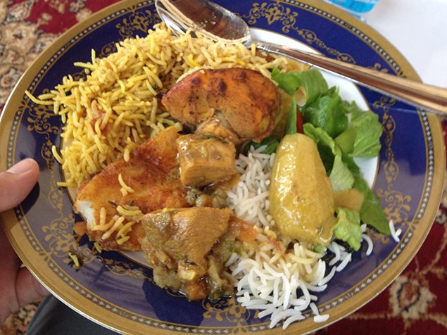 “Abbiamo terminato la visita al museo giusto in tempo per l’ora di pranzo. Dal momento che avevamo appena visitato il centro storico, abbiamo deciso di pranzare in un ristorante tipico del posto, e di provare il cibo degli emirati. Una volta entrati nel ristorante, i camerieri ci hanno condotto al secondo piano, dove le sale erano più ventilate. I nostri camerieri indossavano degli abiti particolari: l’uomo vestiva un abito bianco chiamato “kandura“, mentre la donna un abito nero dal nome “abaya“.”