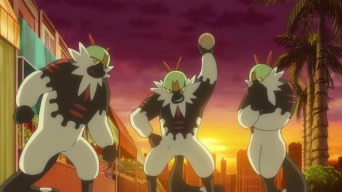 È sera ed Ash sta facendo un giro al mercato di Hau’oli. All’improvviso tre Passimian, seguiti da altri tre esemplari della stessa specie, lanciano una noce di cocco che arriva accidentalmente in faccia a Ketchum, causandogli una brutta caduta. Rowlet, ancora addormentato, esce dallo zaino del nostro eroe e – confuso per il frutto lanciato in quella direzione – viene raccolto dalle scimmie. I Passimian si accorgono presto del loro sbaglio; essi restituiscono ad Ash il mostriciattolo Erba/Volante ed ottengono cambio la noce di cocco. Si intromettono poi le altre tre scimmie, caratterizzate da alcune macchie rosse sul loro manto. Esse si tuffano addosso al Passimian col frutto tra le zampe, lo scagliano in aria ed infine gli rubano “palla”, che viene esibita con soddisfazione. I tre vincitori si allontanano, mentre giunge sul posto l’Agente Jenny, che con l’aiuto di Ash porta Tiny (la scimmia ferita, nonché il capobranco dei Passimian di Mele Mele) nel Centro Pokémon più vicino. Il giorno dopo, a scuola, Ash racconta la sua avventura ai propri amici e Kawe rivela che il nostro eroe si è probabilmente imbattuto nei Passimian di Akala, famosi per la loro aggressività. Secondo Kukui, la noce di cocco è un oggetto posseduto dal capobranco dei Passimian e, quindi, Tiny ha di fatto perso il suo titolo. In seguito Ash e Jenny si recano nella foresta, dove abita il branco dei Pokémon Giocosquadra. Insieme a loro giungono lì i tre Passimian di Akala, che non tardano a reclamare i propri diritti di boss e a farsi servire dalle altre scimmie. Nessuno, Tiny incluso, ha il coraggio di protestare.