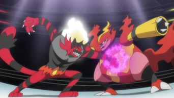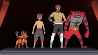 Il giorno dopo, Ash si incontra con i suoi amici allo Stadio Royale. Il gruppo assiste ad alcune Lotte e, nel momento in cui arriva il turno dello scontro tra Mister Royale e lo sfidante, il Professor Kukui si allontana con la scusa di dover fare shopping. Egli corre verso i camerini, indossa il proprio costume ed, ancora con il fiatone, raggiunge l’arena, dove ad attenderlo vi sono già Magmortar ed il suo Allenatore. Incineroar entra in campo ed, improvvisamente, le luci si spengono. Quando esse si riaccendono, il Pokémon Colpibassi è circondato da Golem, Poliwrath, Magmortar e Muk – Pokémon dei Revengers – i quali gli infliggono danni ancor prima che la Lotta abbia inizio. Magmortar prova a sferrare una Mossa Fuoco, tuttavia esso viene fermato dal Torracat di Ash, che lascia il suo Allenatore per aiutare il mostriciattolo in campo. Come se non ci fossero già abbastanza lottatori coinvolti, l’Allenatore di Electivire ed il suo mostriciattolo si uniscono alla mischia! Ash ed i suoi amici trasaliscono nel momento in cui una vettura dorata parcheggia nel bel mezzo dell’arena e da essa scende Bourgain – incontrato nel 70° episodio della serie Sole e Luna – il quale si rivela essere a capo dei Revergers. La sua missione è presto detta: trasformare lo Stadio Royale in un possedimento della Rainbow Happy Resort Company in seguito alla vittoria dei Revengers contro Mister Royale! Per liberarsi di Bourgain, Mister Royale ad Ash – che indossando una maschera veste i panni di “Ash Royale” – accettano di far lottare i propri Incineroar e Torracat contro Magmortar ed Electivire. I primi a scendere in campo sono Incineroar e Magmortar, che sferrano rispettivamente Colpo Infernale e Colpokarate. Il Pokémon Colpibassi dà il cambio a Torracat, il quale lo sostituisce. Il gatto subisce sia Finta che Lancio, dopodiché prova a contrattaccare ma viene fermato da Poliwrath, che si intromette nella Lotta. Magmortar dà il cambio ad Electivire, il quale sferra Sprizzalampo centrando l’avversario. Torracat dà nuovamente il cambio ad Incineroar, che usa Granfisico e respinge con efficacia il nemico. Successivamente Incineroar manda a segno Braccioteso e, con l’aiuto di Kawe e Suiren, intervenuti dagli spalti, viene impedito a Poliwrath e Muk dei Revengers di interferire. Electivire subisce ancora una volta Braccioteso ed entrambi i mostriciattoli danno il cambio ai loro alleati. Torracat subisce diversi attacchi, per poi sconfiggere sia Magmortar che Electivire attraverso Vendetta, una nuova Mossa da lui appresa! Bourgain, fuori di sé, ordina a tutti i Revergers di scendere in campo. Torracat dà un’ultima volta il cambio ad Incineroar, il quale sbaraglia tutti gli avversari per mezzo di Iperschianto delle Tenebre, la sua Mossa Z esclusiva. Bourgain schiera infine Pangoro, ma anche quest’ultimo viene sconfitto! Al termine dello scontro, Mister Royale saluta Ash e fugge nei camerini. Il Professor Kukui torna qualche istante dopo con due buste della spesa tra le mani ed un affanno non indifferente!