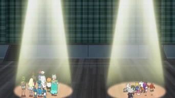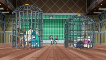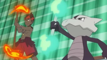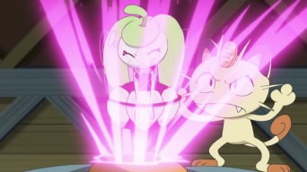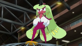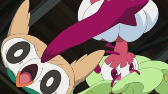 Il giorno della presentazione, Ash ed i suoi amici si riuniscono in un capannone dove l’anziana signora del mercato si esibisce in compagnia del suo Oricorio, dando un raffinato esempio di PokéDanza. Seguono Lylia e Bianchino, il quale pattina e danza su una lastra di ghiaccio; Suiren e Popplio, che crea due Palloni in cui entrano le sorelline della ragazza per poi balzarci sopra; Kawe e Marowak, i quali ruotano con entusiasmo l’uno il proprio osso, l’altro un bastone in fiamme, sino a che il ragazzo non prende accidentalmente fuoco, costringendo Popplio ad intervenire, ed infine Chrys, i cui due Pokémon si fondono in un robot bipede, ma non danzano a causa del ridotto tempo a disposizione per programmare la macchina. Prima che inizino ad esibirsi Ash ed i suoi Pokémon, le luci si spengono improvvisamente ed una voce ordina ad Allenatori e Pokémon di disporsi in due aree diverse della stanza. I nostri eroi, pensando che si tratti di una sorpresa ad opera del Preside Oak, eseguono quanto gli è stato detto, finendo intrappolati in due gabbie metalliche! Ad averli ingannati sono Jessie, James e Meowth, che tuttavia non si sono accorti della mancanza di Steenee nella gabbia. Il Pokémon, infatti, era andato a farsi un giro ed, una volta tornato, cerca di liberare i suoi amici. Esso pesta molte volte un bottoncino nella parta superiore delle gabbie, che Meowth rivela accidentalmente essere il punto debole della trappole, e nel tentativo apprende la Mossa Pestone. D’un tratto, Steenee effettua il processo di evoluzione, trasformandosi in Tsareena. Il Pokémon distrugge con facilità i bottoncini delle gabbie, liberando i suoi amici, e per concludere usa Pestone su Meowth! Il Team Rocket viene recuperato da Bewear e portato nel bosco, mentre Tsareena si diverte a calciare con forza Rowlet!