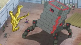Purtroppo, quando Ash torna a scuola, egli riceve la notizia che il Pokémon Bastione è sparito. I nostri eroi vengono informati da Samina che l’Ultracreatura si trova da qualche parte in città e, seguendo le indicazioni, giungono presso il cantiere di Bourgain. I ragazzi scoprono che Stakataka è stato confuso per un piedistallo e, su di esso, è stata posizionata una statua d’oro raffigurante Bourgain. D’un tratto, il Pokémon si alza sulle zampe e, infastidito dalla statua, comincia a dimenarsi. Ash riesce a raggiungere il “tetto” di Stakataka e Pikachu rimuove la statua, tuttavia il Pokémon – avendo ospiti indesiderati su di esso – non smette di muoversi finché l’Allenatore di Biancavilla non lo prega di fermarsi. Quando Ketchum gli promette che, una volta lasciatosi catturare, lo farà tornare da dove è venuto, Stakataka entra volentieri nella UC Ball. La sera stessa, il Pokémon Bastione ha modo di attraversare un Ultravarco e tornare a casa!