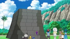 Il giorno dopo, nel cortile della scuola, appare un enorme blocco nero. I ragazzi ipotizzano che si tratti di un ostacolo, quindi Kawe cerca di saltarlo, venendo però inglobato dalla struttura. Egli ne viene sputato fuori un attimo dopo, terrorizzato da quelli che definisce come numerosi occhi che – dentro il blocco nero – lo stavano fissando. Il suono della campana richiama i nostri eroi, che vengono informati da Samina circa una nuova Ultracreatura: Stakataka. Gli studenti riconoscono subito il Pokémon: si tratta del blocco nero apparso nel cortile della scuola! Ash e gli altri fanno dunque ritorno da Stakataka, il quale è ancora fermo dove l’avevano lasciato. Essi tentano di catturarlo, ma il Pokémon schiva ogni UC Ball traslando i blocchi che costituiscono il suo corpo. Dopo una lunga serie di tentativi di cattura, ognuno dei quali fallito miseramente, gli Ultraguardiani decidono che è meglio andare a casa e riprovare ad acchiappare Stakataka il giorno seguente.