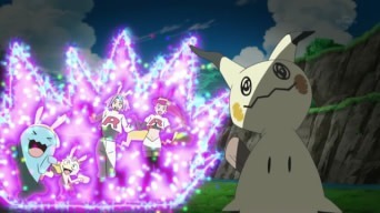 Intanto il Mimikyu del Team Rocket, nascosto dietro ad un cespuglio, osserva i Pikachu della Valle. Jessie, James e Meowth, volendo rapire il Pikachu di Ash ma non sapendolo distinguere dagli altri Topi, decidono di rapire tutti i Pokémon della Valle.