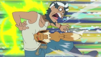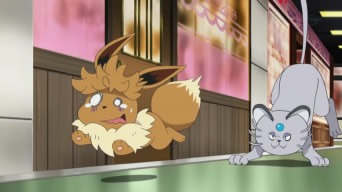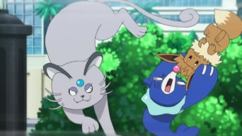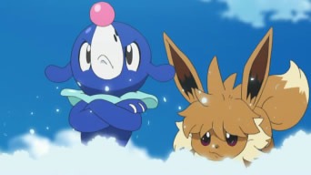 Ad Eevee tornano in mente Pikachu ed i suoi amici, che decide di andare a cercare. Suiren viene a sapere che suo padre tornerà a casa la sera stessa e va al centro commerciale per acquistare delle Malasade. Eevee, che ha notato Popplio mentre entrava nell’edificio, tenta di raggiungerlo, ma viene adocchiato e rincorso da un Persian. Eevee, disperato ed in fuga, attira l’attenzione di Popplio, che si allontana da Suiren per dargli una mano. La ragazza si accorge ben presto che il suo Pokémon è sparito e chiede aiuto ad Ash, Chrys, Ibis, Lylia e Kawe per ritrovarlo. Popplio raggiunge Eevee, col quale si nasconde dietro un cespuglio, ma Persian li scopre e li costringe alla fuga. Il Pokémon Otaria afferra Eevee ed usa Acquagetto, finendo in un corso d’acqua e seminando, così, il nemico. I due giungono sulla spiaggia, dove si imbattono nel Team Skull. I membri del Team iniziano a contendersi Eevee, e Rowlet – mandato alla ricerca di Popplio – assiste alla scena, potendo indicare ad Ash e gli altri dove recarsi. I nostri eroi giungono sulla spiaggia e Suiren ordina a Popplio di usare Acquagetto, Mossa che tuttavia acquista le sembianze di Surf! Eevee cavalca l’onda insieme a Popplio e sferra un potente Sdoppiatore sui nemici, che vengono spazzati via. Alla fine della Lotta, Suiren cattura Eevee in una Sub Ball e lo soprannomina “Marin” dato che sembra adorare il mare. La sera stessa, a casa, la ragazza dai capelli blu festeggia il ritorno di suo padre ed accorcia la frangia di Eevee, aiutandolo a vedere meglio.