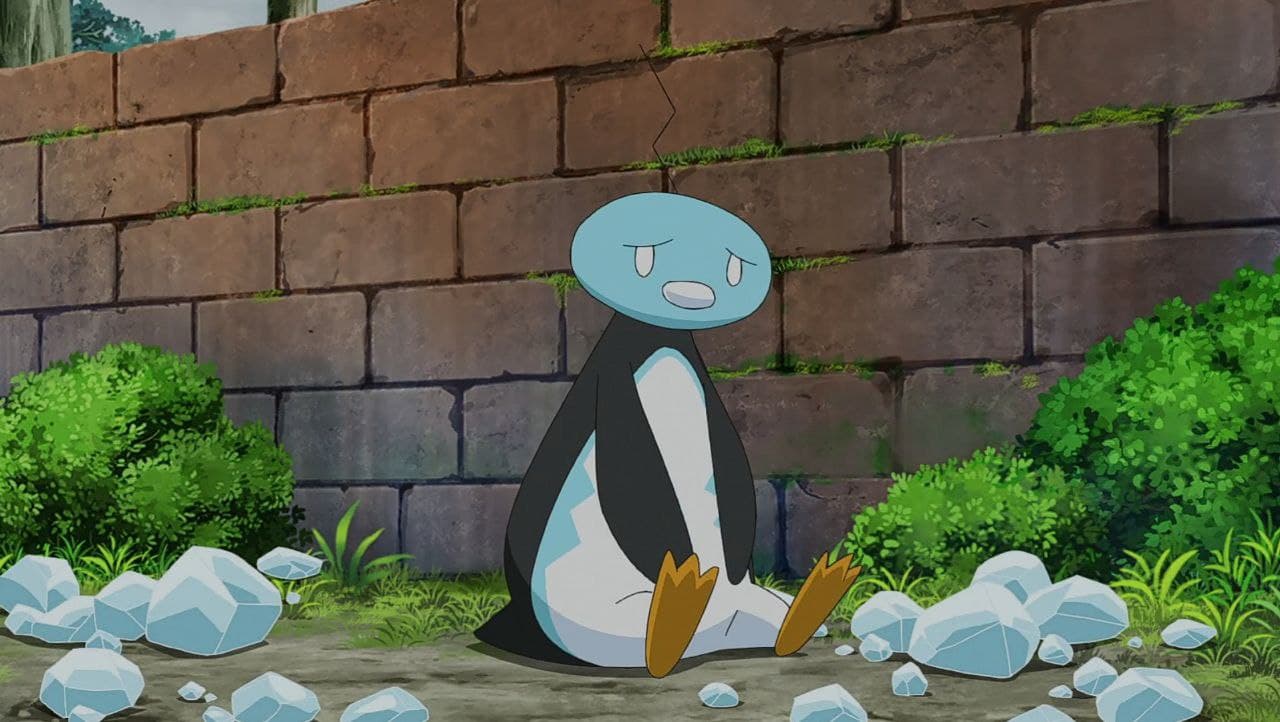 L’episodio prosegue con Goh che, grazie all’aiuto dei suoi Pokémon, motiva il capitano facendogli ritrovare la fiducia in se stesso. Insieme tornano da Ash e il capitano si ricongiunge alle altre creaturine, con grande sollievo di Pikachu. Dal folto del bosco sbuca un esausto Eiscue che, accidentalmente, ingaggia battaglia con Falinks. Il Pokémon Schieramento, dopo lo smarrimento iniziale, riesce a sconfiggere il Pokémon Pinguino distruggendogli persino il suo cubo di ghiaccio. Smascherato, Eiscue fugge via e Falinks esulta per la vittoria e per l’ottima battaglia.