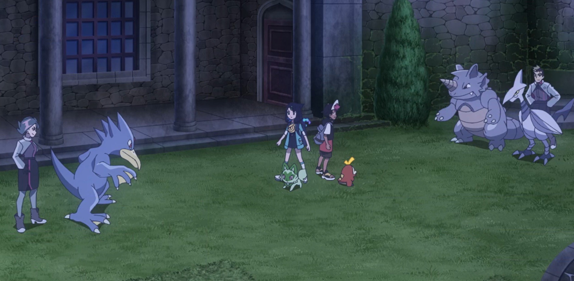 Mentre il gruppo riflette sull’esito dell’incontro, viene raggiunto da Zirc e Rhydon. Liko e Roy decidono così di scappare calandosi da una scala di emergenza collocata all’esterno della torre in cui si trovano. A terra trovano però Onia e Golduck, pronti ad affrontarli. Capendo di essere circondati, i due amici schierano Fuecoco e Sprigatito contro Rhydon e Golduck. Usando degli attacchi di tipo Erba e Terra, Sprigatito e Fuecoco riescono ad avere la meglio sugli avversari.