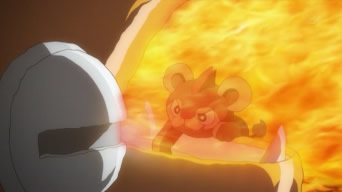 I ragazzi, entrati in una immensa distesa erbosa, riescono ad osservare un branco di Pyroar selvatici con i loro cuccioli. Uno di questi, in particolare, viene ferito ed abbandonato dal padre secondo quanto dettato dalla natura: il leoncino deve infatti isolarsi e puntare al rafforzamento dello spirito. Il mostriciattolo Normale/Fuoco intraprende il suo “viaggio di formazione” e, data l’insistenza di Clem, viene avanzata la proposta di seguirlo ed assicurarsi che stia bene. Intanto il Team Rocket aspira a catturarlo; ed è proprio durante un tentativo di acchiappare Litleo che i tre ladri vengono fermati da Pyroar. Il leoncino si accorge della presenza del padre, ma continua il viaggio nella speranza di rendere quest’ultimo orgoglioso di sé. Senza esser visto, l’Allenatore di Kanto salva due volte il mostriciattolo, che infine raggiunge la sua meta: una montagnola su cui crescono alberi di Baccarancia! Pyroar – constata l’autonomia del figlio – si appresta ad andarsene, quando il Team Rocket usa un robot gigante per intrappolarlo. I ragazzi e Litleo provano ad aiutarlo, ma il cucciolo finisce per esser colpito e sconfitto dal macchinario a forma di Charizard. Assistendo a tale scena, il mammifero dalla criniera rossa perde il controllo e sprigiona una Vampata che, anziché fermare il Trio, dà ad esso la possibilità di scagliare l’attacco contro i presenti. Ma il leoncino non fugge: al contrario, si tuffa nella potente mossa Fuoco ed entra nel robot, raggiungendo la gabbia in cui si trova Pyroar. Il Re della savana torna in sé e Frogadier libera entrambi, partecipando quindi alla sconfitta di Jessie, James e Meowth. Dopo aver detto addio a suo padre, Litleo si incammina verso un punto ignoto della savana ed anche Ash riparte con gli amici, sulla strada per Frescovilla!