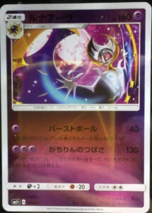 Lunala è di tipo Psiche, ha 160 PS e due attacchi: Shatter Shot (Colpo Distruttivo) che infligge 40 danni x il numero di carte Energia Psiche assegnate a questa carta, e Wings of the Moone (Ali della Luna), che infligge 130 danni e permette di spostare a piacimento tutte le carte Energia di questa carta ai tuoi Pokémon in panchina.