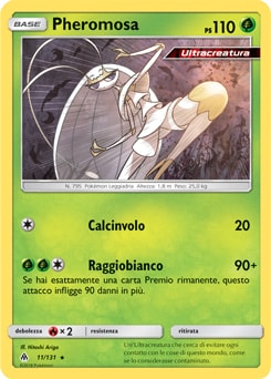 L’Ultracreatura Pheromosa entra in scena nel GCC Pokémon con il suo stile inimitabile nella sua micidiale semplicità. Nonostante questo Pokémon di tipo Erba non sia né un Pokémon-GX né tantomeno una carta stella prisma, si difende egregiamente con 110 PS e un costo di ritirata pari a zero. Pheromosa può farti chiudere la partita in bellezza con l’attacco Raggiobianco che ti permette di infliggere ben 180 danni se ti resta un’unica carta Premio. E visto che non è un Pokémon-GX, se il tuo avversario dovesse riuscire a mandarlo KO, potrà rivendicare una sola carta Premio invece di due.