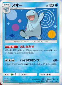 Quagsire, raffigurato sorridente e con uno sfondo semplicemente bellissimo, è di tipo Acqua, ha 120 PS e l’abilità Wash Out (Lavaggio) che ha il seguente effetto: quante volte vuoi durante il tuo turno, prima della fase di attacco, puoi spostare un’Energia Acqua da un tuo Pokémon in panchina al tuo Pokémon attivo. L’unico attacco della carta è Idropompa che infligge 60 danni + altri 20 danni per ogni Energia Acqua assegnata a questo Pokémon.
