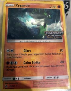 Zygarde, già presente nell’espansione come rara olografica, con i suoi 130 Punti Salute e i suoi due attacchi: Glare 20 danni al costo di due Energie Incolore e la possibilità con il lancio della moneta di lasciare paralizzato il Pokémon attivo avversario e Calm Strike, una Energia Lotta e due Incolore per 60 danni con la possibilità di raddoppiare questo danno se si è già ricorsi al proprio Attacco GX durante la partita.