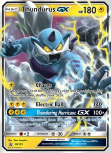 Thundurus-GX si presenta di tipo Lampo, in un’evocativa illustrazione e con i classici 180 PS che contraddistinguono i Pokémon Base GX. Il Pokémon Fulminante presenta due attacchi normali e una mossa GX: il primo di questi, Sottocarica, richiede una sola Energia Elettro e permette di pescare un’ulteriore Energia Elettro e aggiungerla al Pokémon attivo. Il secondo attacco, Energisfera, richiede tre Energie Elettro e infligge ben 140 danni!
