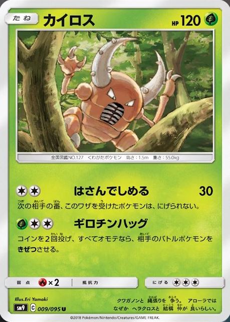 Pinsir è di tipo Erba, ha 120 PS e due attacchi: il primo è Grip and Squeeze (Prendere e Spremere) che infligge 30 danni e impedisce al Pokémon difensore di ritirarsi durante il prossimo turno del tuo avversario. Il secondo attacco della carta è Guillotine Hug (Abbraccio Ghigliottina) che ha il seguente effetto: lancia per 2 volte una moneta. Se esce testa entrambe le volte, il Pokémon attivo del tuo avversario viene messo KO.