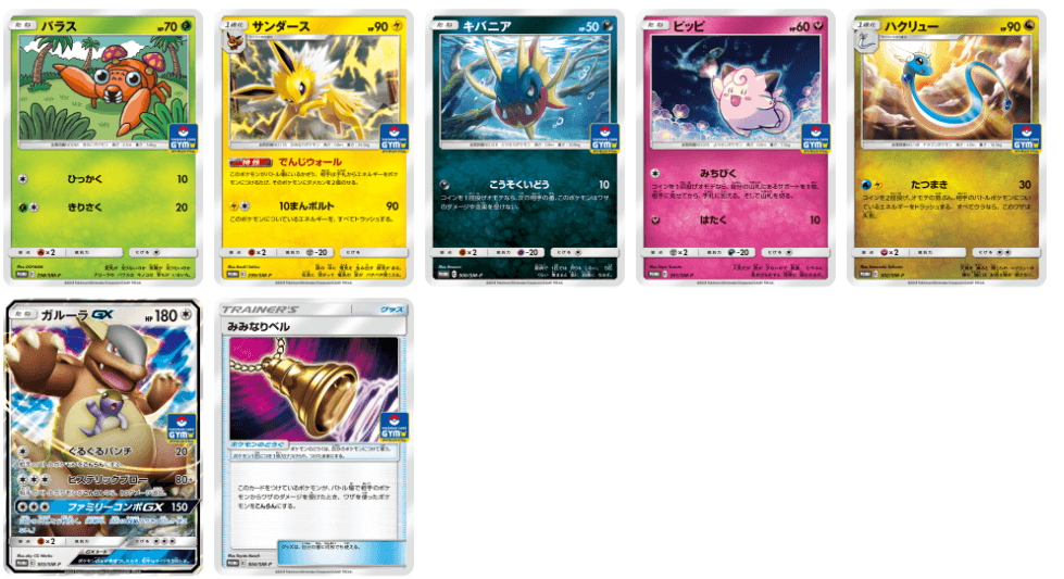 Tra tutte, spiccano la magnifica versione di Kangaskhan-GX e la bellissima carta di Jolteon illustrata da Kouki Saitou. Le altre carte disponibili sono Paras, Clefairy, Dragonair, Carvanha e la carta Strumento Campana Tinnito.