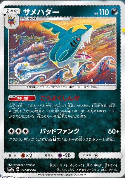 Sharpedo è di tipo Oscurità, ha 110 PS e l’abilità Greedy Evolution (Evoluzione Ingorda) che ha il seguente effetto: quando giochi questa carta dalla tua mano per evolvere uno dei tuoi Pokémon durante il tuo turno, puoi guardare le prime 6 carte in cima al tuo mazzo. Scegli quante Energie Oscurità desideri tra quelle che trovi in questo modo e assegnale a questo Pokémon. Quindi, rimischia il mazzo.