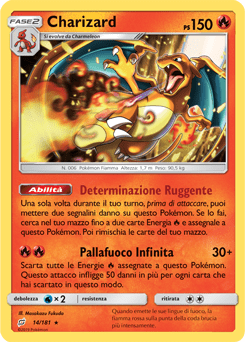 Nell’espansione Sole e Luna – Gioco di Squadra la carta dedicata a Charizard, uno dei beniamini del mondo Pokémon, è decisamente tra quelle più interessanti. L’abilità Determinazione Ruggente consente di cercare nel proprio mazzo fino a due carte Energia di tipo Fuoco da assegnare a Charizard. Non male, eh? Ma c’è un rovescio della medaglia: devi prima mettere due segnalini danno su questo Pokémon. Potrebbe valerne la pena, però. L’attacco Pallafuoco Infinita, infatti, infliggerà 30 danni + altri 50 danni aggiuntivi per ogni Energia di tipo Fuoco assegnata a Charizard che verrà scartata. Sacrificare una parte dei PS di Charizard per infliggere molti più danni: del resto, la robustezza di questo Pokémon è risaputa!