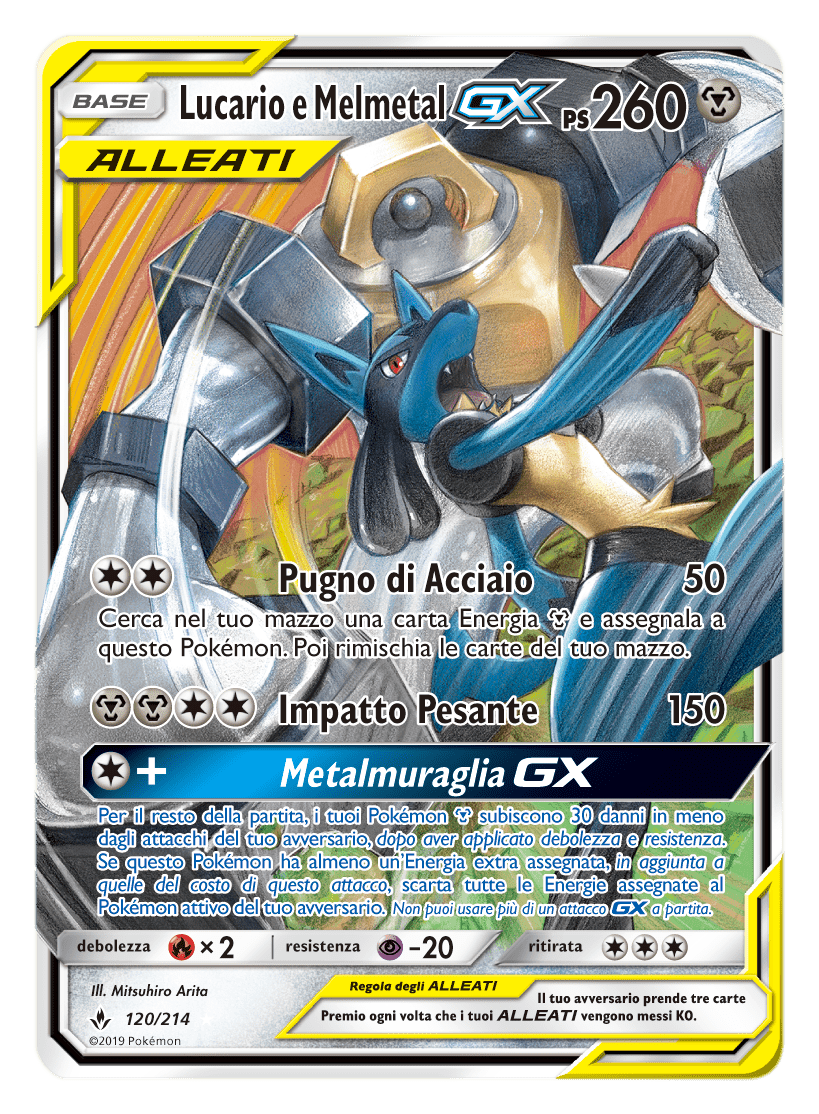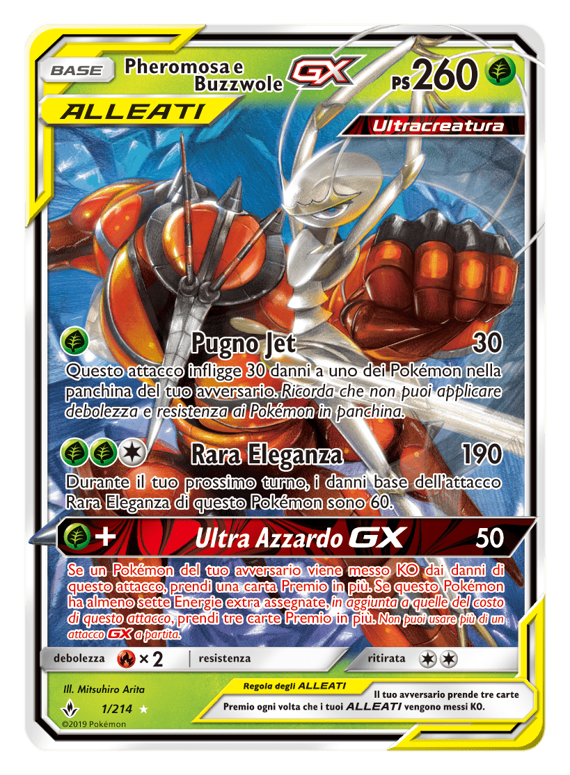 Dall’espansione giapponese Full Metal Wall, solo leggermente meno recente, arriveranno in Italia i tanto attesi Pheromosa e Buzzwole-GX ALLEATI insieme a Lucario e Melmetal-GX ALLEATI.