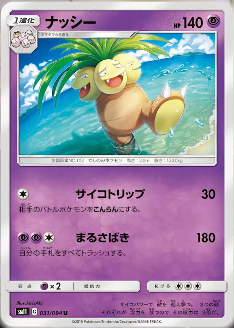 Exeggutor è un Pokémon Fase 1 di tipo Psiche con 140 Punti Salute, una debolezza al tipo Psiche, nessuna resistenza e un costo di ritirata pari a 3. Il suo primo attacco Mind Bend infligge 30 danni e lascia il Pokémon Difensore confuso. Judgement infligge 180 danni ma richiede di scartare la propria mano.