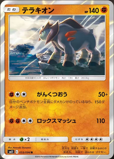 Terrakion è un Pokémon Base di tipo Combattimento da 140 Punti Salute, una debolezza al tipo Erba, nessuna resistenza e un costo di ritirata pari a 4. Il suo primo attacco Cave King infligge 50 danni più altri 150 se ogni Pokémon nella nostra panchina ha segnalini danno su di sé. Rock Smash infligge 110 danni.