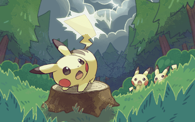 Le prime due illustrazioni di cui ci occupiamo ritraggono i due protagonisti degli ultimi titoli per Nintendo Switch! A sinistra possiamo ammirare un Pikachu meravigliato intento a sfruttare la propria abilità Parafulmine nel mezzo di un bosco, mentre due suoi simili lo osservano con espressioni estremamente sorprese. Accanto troviamo una scena dai toni pastello raffigurante un Eevee intraprendente, che non si lascia intimidire dagli ostacoli e sguscia sotto a una recinzione per andare alla scoperta di nuovi luoghi da esplorare.