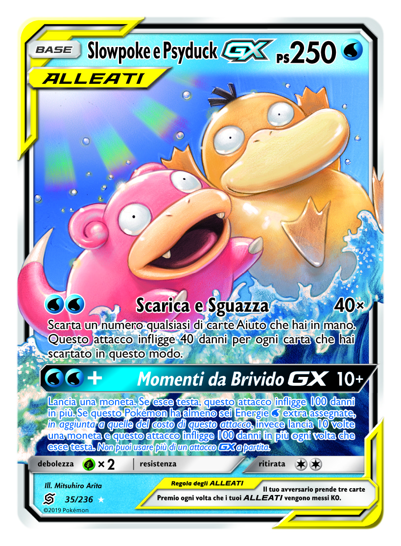 Carino e adorabile, nonostante abbiano un’immagine un poì goffa, Slowpoke e Psyduck hanno deciso di unirsi in un team. Volevamo che avessero degli attacchi che dal loro punto di vista fossero seri, mentre agli occhi di tutti gli altri sarebbero sembrati abbastanza scherzosi e divertenti. Un attacco che scarta carte Aiuto dalla propria mano o un attacco GX che implichi lanciare dieci volte una moneta saranno unici di questo duo. Ci auguriamo i giocatori si divertiranno a lanciare questi attacchi.