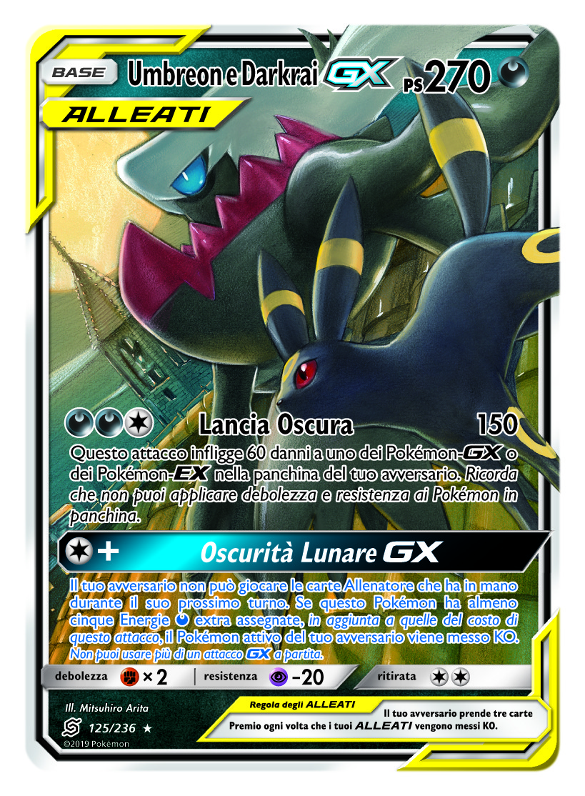 Inizialmente volevamo creare dei mazzi tematci dedicato al tipo Pische e Oscurità per il Giappone. Abbiamo quindi scelto Espeon per il tipo Psiche e Umbreon per quello Oscurità, come campioni in contrasto per i loro tipi. Allo stesso modo come Espeon si è unito a Deoxys, Umbreon si è unito a Darkrai, un altro misterioso molto amato del brand Pokémon. Quando ci siamo immaginati Umbreon e Darkrai, l’immagine di loro due fianco a fianco di notte nelle strade cittadine ci ha da subito convinto che la loro carta sarebbe stata fantastica.