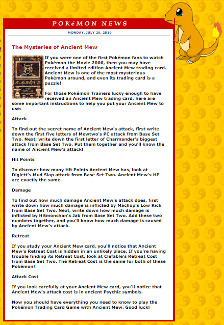 Successivamente sui canali ufficiali venne rilasciato un documento di testo grazie al quale, con diversi riferimenti a carte note, era possibile tradurre le informazioni tecniche e numeriche sulla carta di Mew Antico.