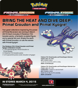 Le carte mostrano Kyogre-EX e Groudon-EX con un’illustrazione diversa, ma altro non sono che delle semplici ristampe delle omonime carte che saranno presenti all’interno dell’espansione XY – Scontro Primordiale, in uscita a febbraio 2015 in Italia e nei paesi anglofoni.