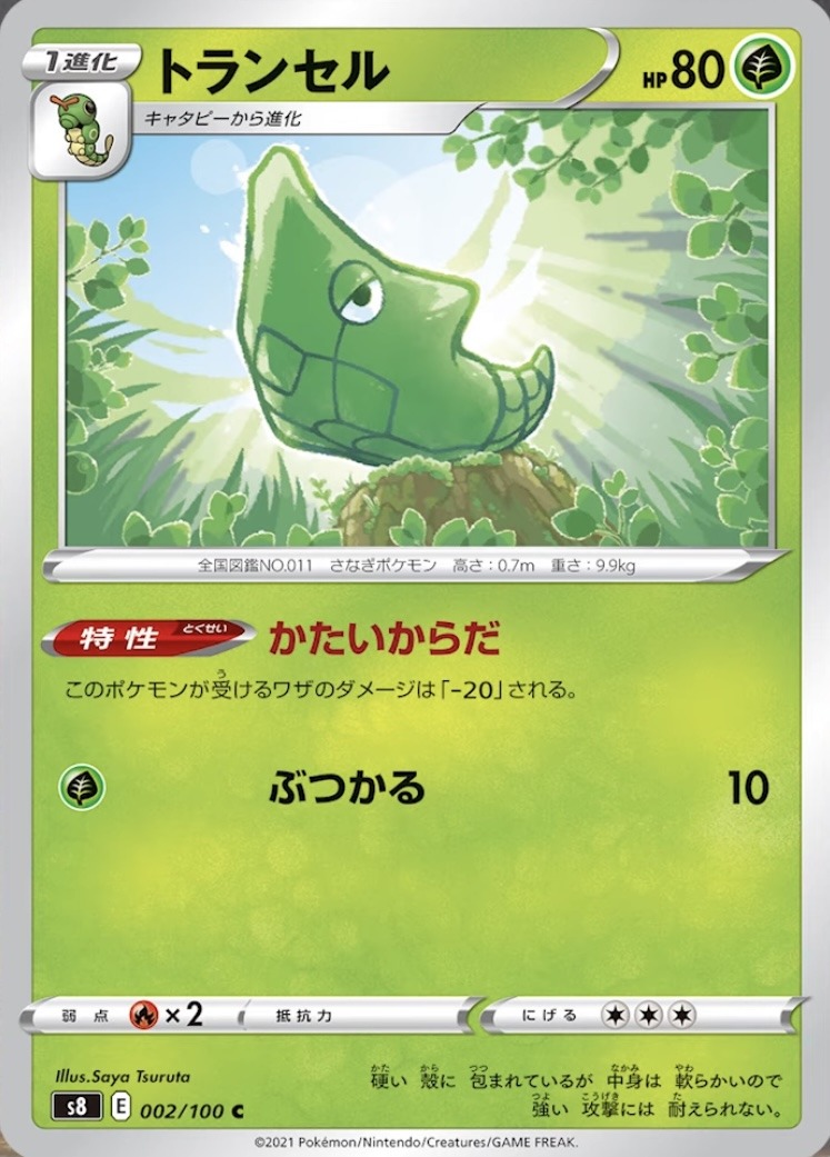 La carta di Metapod invece lo rappresenta poggiato su una roccia, con il sole che lo illumina a pieno. Quest’artwork ricorda vagamente la scena di uno dei primi episodi dell’anime nella battaglia contro Samurai nel Bosco Smeraldo. L’attacco non è particolarmente utile in quanto infligge dieci danni, mentre l’abilità permette di ridurre di venti tutti i danni subiti dal Pokémon.