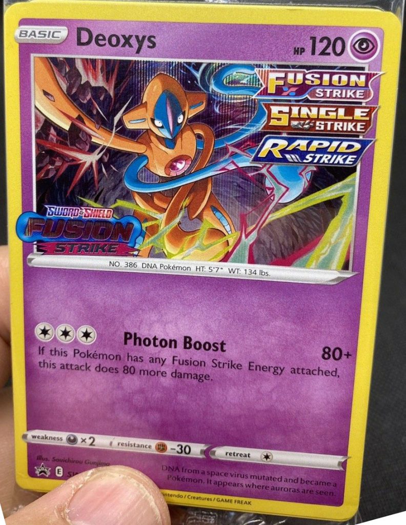 Le altre due carte saranno un bellissimo Latias di tipo Drago e Deoxys. In particolare risulta particolarmente curioso il Pokémon Leggendario di tipo Psico: come si nota chiaramente infatti la carta è piuttosto “intasata” di indicazioni come Colpo Rapido o Colpo Fusione. Come sempre queste carte saranno disponibili nei Build & Battle Box, sia in versione normale che in versione Stadium.