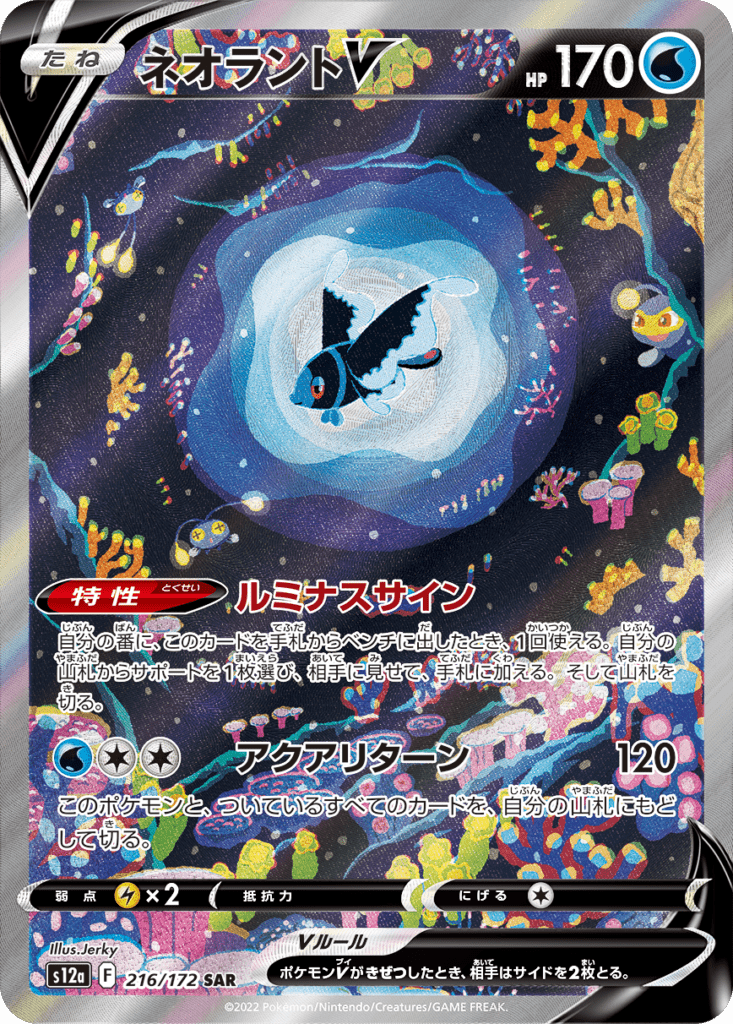Oltre alle dieci carte viste finora, ne sono state svelate ben otto con livello di rarità SAR. Di queste, quattro rappresentano Pokémon-V e altre quattro ritraggono Allenatori. Oltre a Lumineon-V, è possibile apprezzare tre carte meravigliose dedicate a Suicune-V, Entei-V e Raikou-V. Come per gli uccelli leggendari di Galar, anche in questo caso le illustrazioni lasciano trasparire tutta la potenza dei tre cani leggendari. Le carte Aiuto Full Art, infine, vedono protagonisti Camilla, Petra, Gardenia e Laburno.