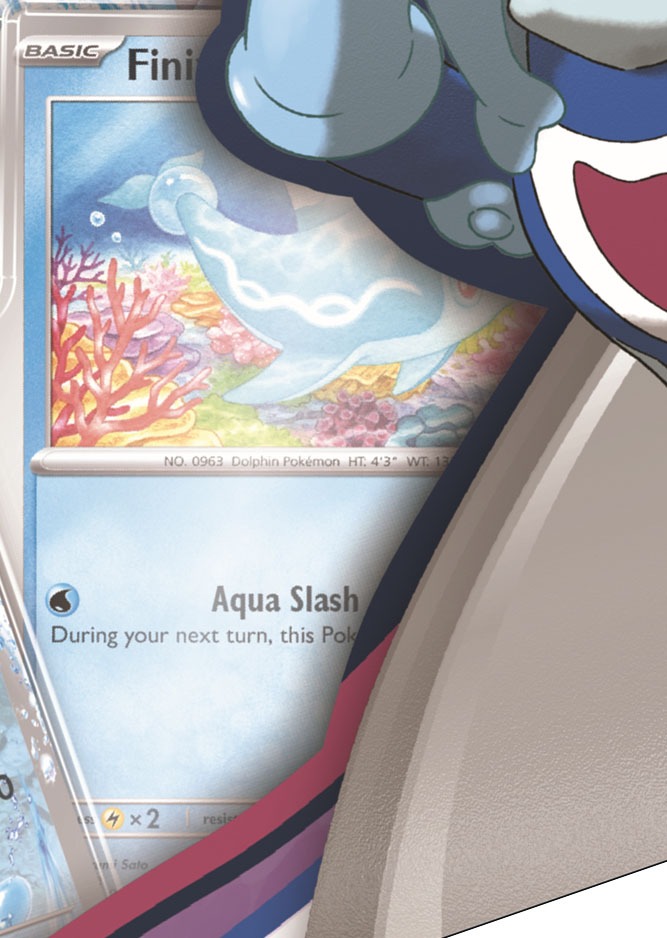 Prima di scoprire cosa troveremo all’interno della collezione, conosciamo meglio i protagonisti di questo nuovo articolo del GCC, Finizen e Palafin. Come già scritto, questa linea evolutiva è stata introdotta nei titoli di nona generazione e sicuramente ha colpito il pubblico per alcune sue peculiarità. Prima di tutto il metodo evolutivo, del tutto inedito e incentrato sulla modalità cooperativa della Cerchia contatto, inserita proprio tra le meccaniche di gameplay di Pokémon Scarlatto e Violetto. Inoltre, la linea evolutiva presenta due Pokémon pressocché identici, se non per un particolare: una decorazione a forma di cuore sul ventre di Palafin, stadio evolutivo finale della linea. Il motivo? Il Pokémon è basato sulla figura dei supereroi e il suo aspetto identico a Finizen è un chiaro riferimento ai supereroi stessi, che cercano di nascondere la loro vera identità.
