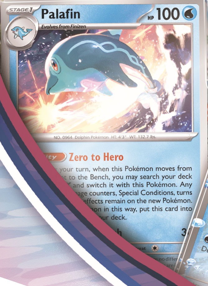 Attraverso l’abilità della carta di Palafin (Forma Ingenua), Zero to Hero (traducibile in italiano come Supercambio, come nei videogiochi), è possibile giocare Palafin ex, grazie a Hero’s Spirit (Spirito dell’Eroe), la sua abilità. Dotato di una gran quantità di PS, ben 340, il Pokémon Eroe possiede una sola mossa, Giga Impact (Gigaimpatto), che con una carta Energia Acqua infligge 250 danni all’avversario (non potendo però attaccare nel turno successivo).