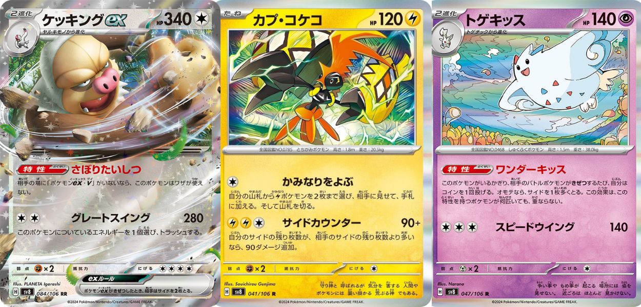 Tapu Koko, invece, può infliggere un totale di 180 danni al Pokémon attivo avversario con due Energie Lampo e una Incolore, a patto però che si abbiano più carte premio rimanenti rispetto all’avversario. L’elemento più interessante di Togekiss è sicuramente l’Abilità: ogni volta che mettiamo K.O. un Pokémon avversario possiamo lanciare una moneta. Se l’esito è positivo, allora potremo pescare una carta premio aggiuntiva!