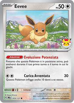 La carta promozionale in questione è una ristampa della carta numero 074/131, proveniente dall’espansione Pokémon Scarlatto e Violetto – Evoluzioni Prismatiche, con, però, la presenza del logo del Pokémon Day 2025 al lato dell’illustrazione. Questo Eevee possiede l’abilità Evoluzione Potenziata e la mossa Carica avventata. La sua abilità alquanto particolare, gli permette di evolversi durante lo stesso turno nel quale viene giocato, stando in posizione attiva: scavalcando, così, un grande divieto e potendo sferrare le mosse della propria eeveeluzione il più velocemente possibile.