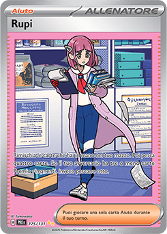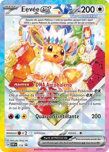 La seconda è Eevee-ex, presente nella stessa espansione, realizzata dall’autrice Natsuko Shoji. Il suo tocco è immediatamente riconoscibile: all’interno dell’illustrazione compare infatti una crostata di frutta, riprodotta direttamente nella carta, chiaro richiamo a una delle sue creazioni più celebri che realizza ogni giorno nel suo ristorante été di Tokyo, considerato tra i più raffinati ed esclusivi della capitale giapponese.