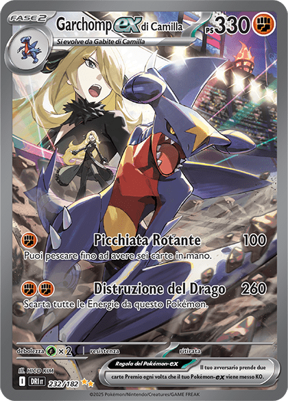 Tra le pose più dinamiche e solenni spiccano quelle realizzate nello stile di HICO KIM, che nell’espansione Scarlatto e Violetto – Luce Nera ci mostra Cobalion colto nell’attimo precedente a sferrare un attacco destinato a lasciare il segno. L’apice della sua arte, però, viene raggiunto con Garchomp-ex, un Pokémon che di per sé incute già grande timore. Se poi al suo fianco compare la sua allenatrice Camilla, campionessa di Sinnoh, la tensione sale alle stelle, le gambe cedono e la paura prende inevitabilmente il sopravvento.