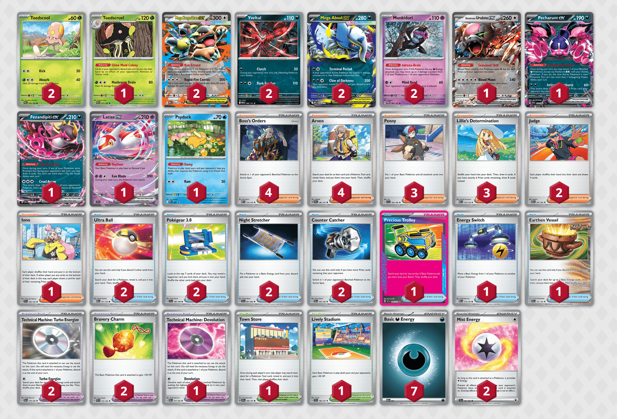 Ma da dove spostano i danni i Munkidori? Dal tank del formato per eccellenza, MegaKangaskhan-ex (MEG104), che con la loro abilità Sbrigare Commissioni ci aiutano anche a pescare svariate carte. Troviamo poi nella lista del mazzo anche Toedscruel (PAR17), che aiuta soprattutto nel match-up contro Gholdengo con la sua abilità Colonia Melmamuffa, che impedisce di aggiungere alla mano le carte presenti nella pila degli scarti. Vediamo poi due copie di Macchinario Tecnico: Turboenergia (PAR179) che ci permette di assegnare molto più velocemente Energie ai nostri Pokémon e due copie di Amuleto del Coraggio (PAL173), obbligatorio giocando solo Pokémon Base. L’Asso Tattico è Carrello Pregiato (SSP185), molto forte dato che questo mazzo ha bisogno di riempirsi la panchina il più velocemente possibile. MegaAbsol-ex si fa sempre più spazio nel meta a suon di Attimo Finale!