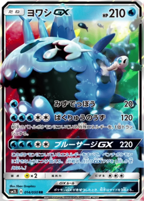 Wishiwashi-GX è di tipo Acqua, ha 210 PS e due attacchi normali: Pistolacqua, che infligge 20 danni, e Microburst Vortex (Vortice Esplosivo), che infligge 120 danni e scarta una carta Energia speciale dal Pokémon Attivo avversario.