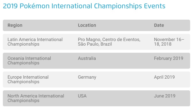 - Campionati Internazionali Europei Pokémon: CP ottenuti dal 19 novembre 2018 all’ultima giornata dei Campionati Oceaniani a febbraio 2019;