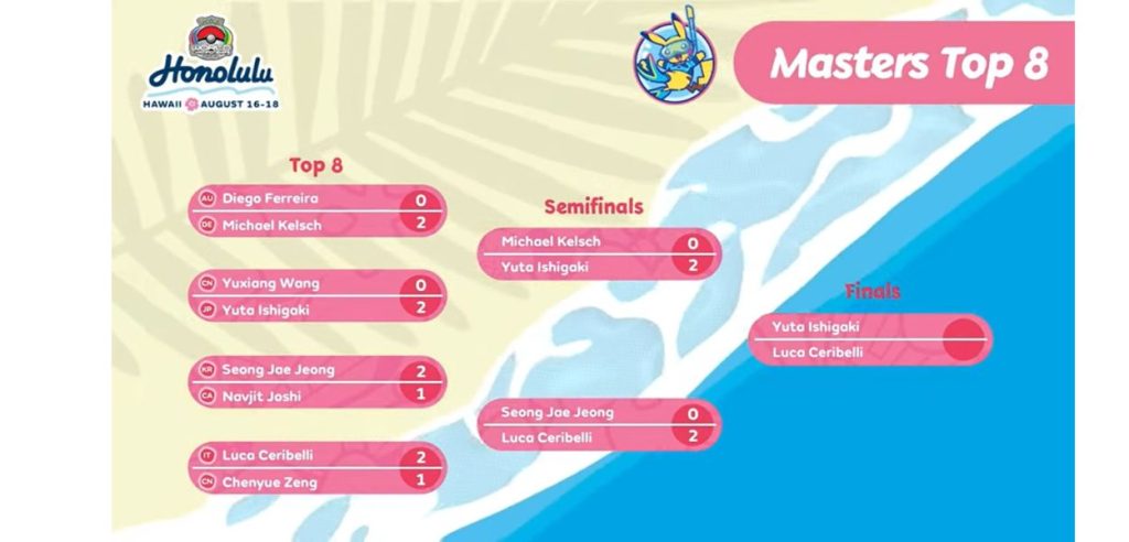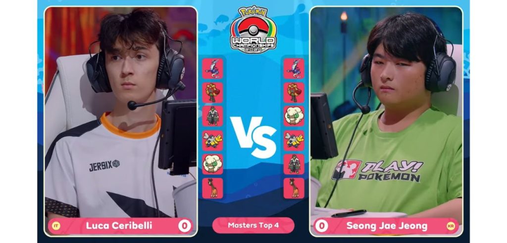 Il team di Luca è composto dai seguenti Pokémon: Miraidon, Whimsicott, Ogerpon (Maschera Focolare), Urshifu (Stile Pluricolpo), Farigiraf e Manoferrea. È proprio grazie ai due Pokémon del futuro Miraidon e Manoferrea, introdotti proprio in Pokémon Scarlatto e Violetto, uniti al Mazzuolegno (Wood Hammer) di Ogerpon che Luca Ceribelli è riuscito a infliggere una sonora sconfitta per 2 a 0 al semifinalista coreano Seong Jae Jeong. La finale sarà contro il giapponese Yuta Ishigaki, capace di sbaragliare tutti i suoi avversari grazie alla potenza di Calirex Cavaliere Glaciale e… Pelliper!