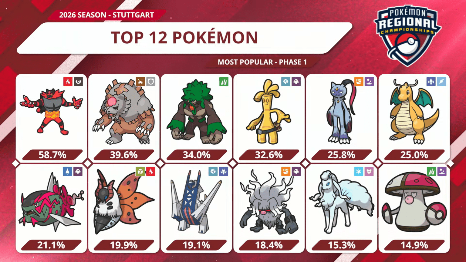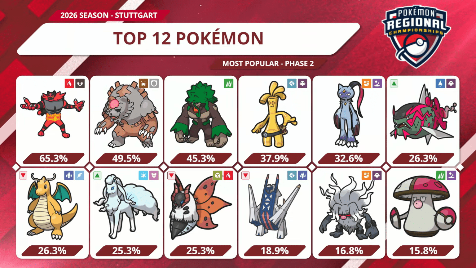 I numeri evidenziano un marcato consolidamento dei Big del formato. Incineroar e Ursaluna Luna Cremisi, già pilastri del metagame, hanno visto la loro presenza aumentare notevolmente tra i top player, confermando la loro natura di fondamenta della Reg H.