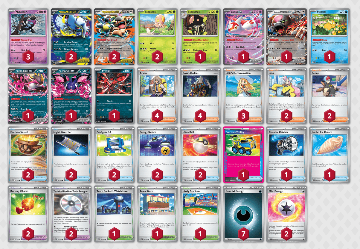 Edwyn Mesman riesce a dominare a Londra e ad alzare la coppa grazie al suo mazzo di Mega Absol-ex (MEG86)! È un mazzo che da tempo si è imposto nel meta, ottenendo diversi risultati davvero interessanti negli ultimi mesi. La strategia del mazzo è quella di sfruttare il più possibile l’attacco Attimo Finale di Mega Absol-ex per mandare direttamente K.O. il Pokémon attivo del nostro avversario. Per riuscirci, però, ci serve che il Pokémon che vogliamo attaccare abbia esattamente sei segnalini danno sopra.