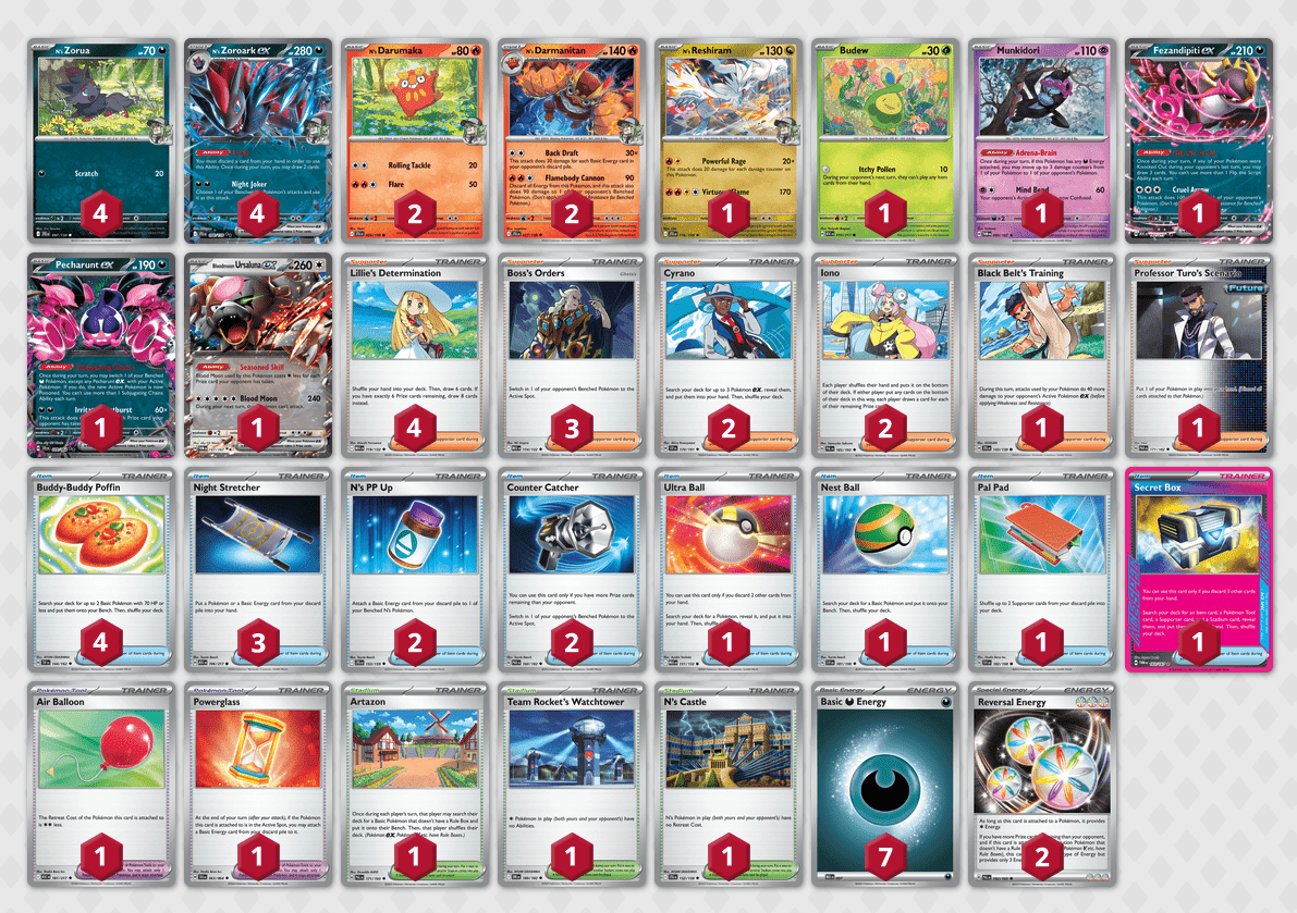 Tra i Pokémon troviamo poi una copia di Munkidori, una copia di Budew (PRE4) e una copia di Pecharunt-ex (SFA39), utile sia per evitare di rimanere bloccati con alcuni nostri Pokémon in posizione Attiva sia per il suo attacco Irritascoppio, che infligge 60 danni per ogni carta Premio presa dal nostro avversario. Vediamo poi quattro copie di Determinazione di Lylia (MEG119), due copie di Allenamento di Cinturanera (JTG143) per aumentare i nostri danni, due copie di PP-su di N (JTG153), una copia di Clessidra Energetica (SFA63) fondamentali dopo aver copiato l’attacco di Darmanitan di N e una copia di Castello di N (JTG152).