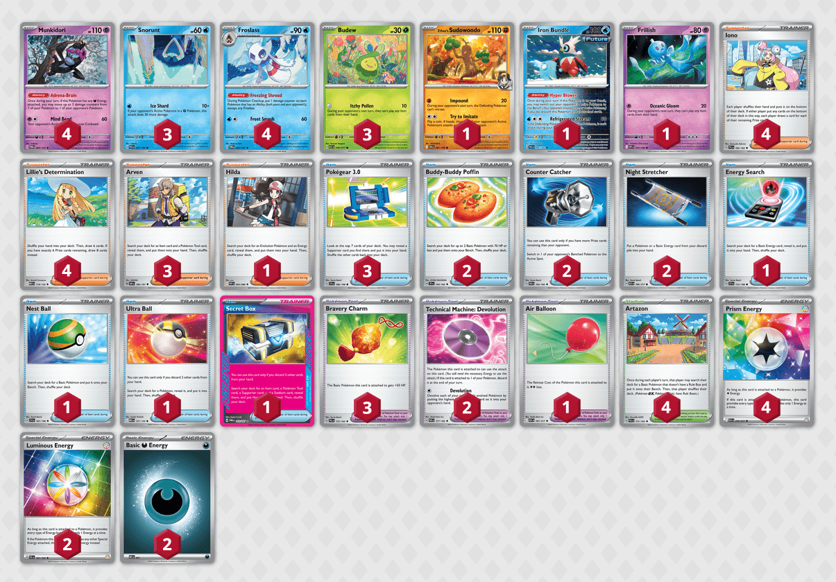 In Top 32 troviamo un mazzo che da ormai mesi non faceva un risultato così importante: il cosiddetto Froslass-Munkidori. Lo scopo del mazzo è quello di usare l’abilità Manto Glaciale di Froslass (TWM53), che, durante il controllo Pokémon, mette un segnalino danno su ogni Pokémon in campo che ha un’Abilità (ad eccezione di qualsiasi Froslass). Questa strategia, in termine più tecnico, si chiama “spread” (dall’inglese to spread, sparpagliare), poiché il nostro obiettivo sarà appunto quello di sparpagliare danni tra tutti i Pokémon in campo e prendere così diversi K.O. in un turno solo!
