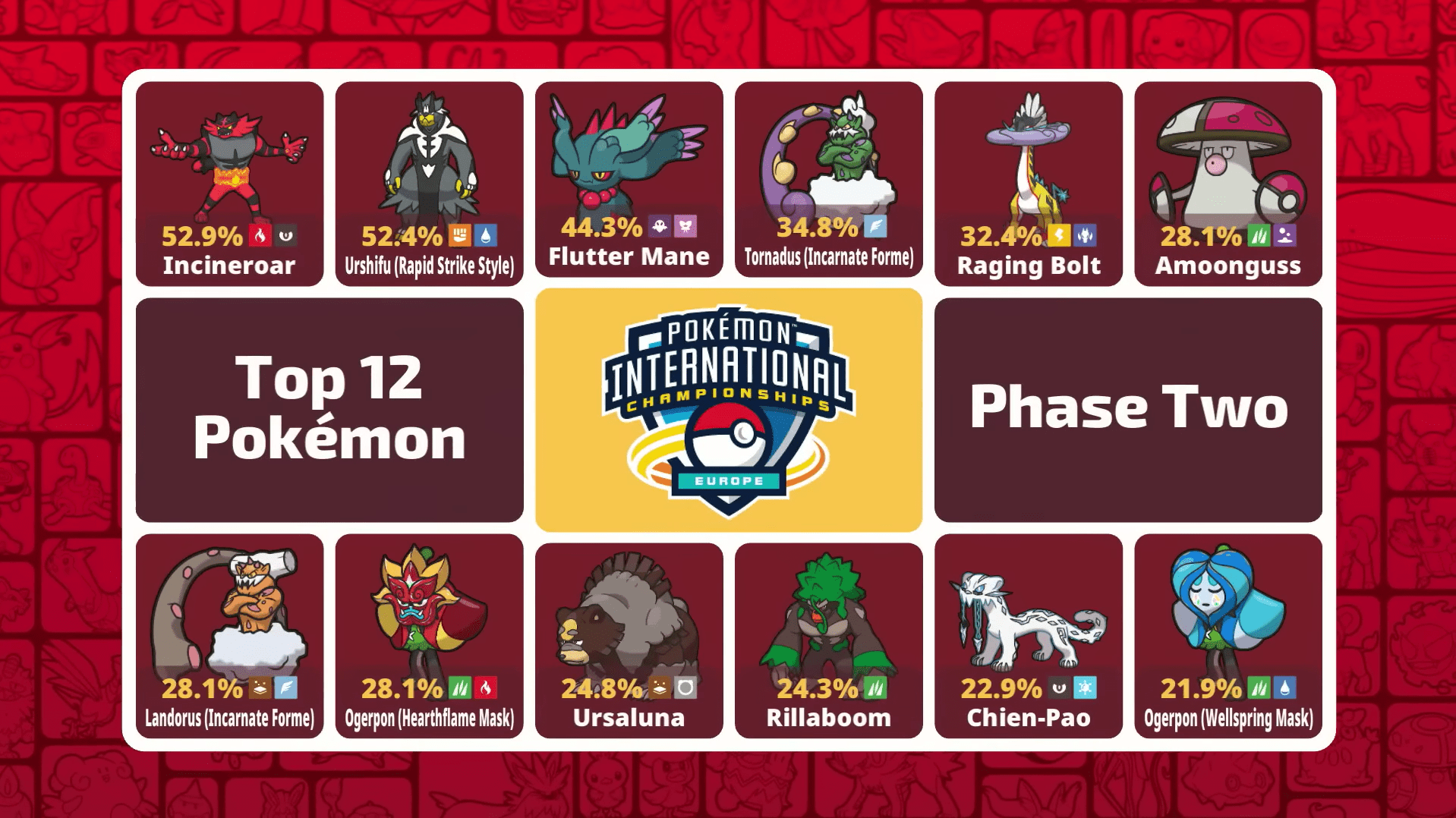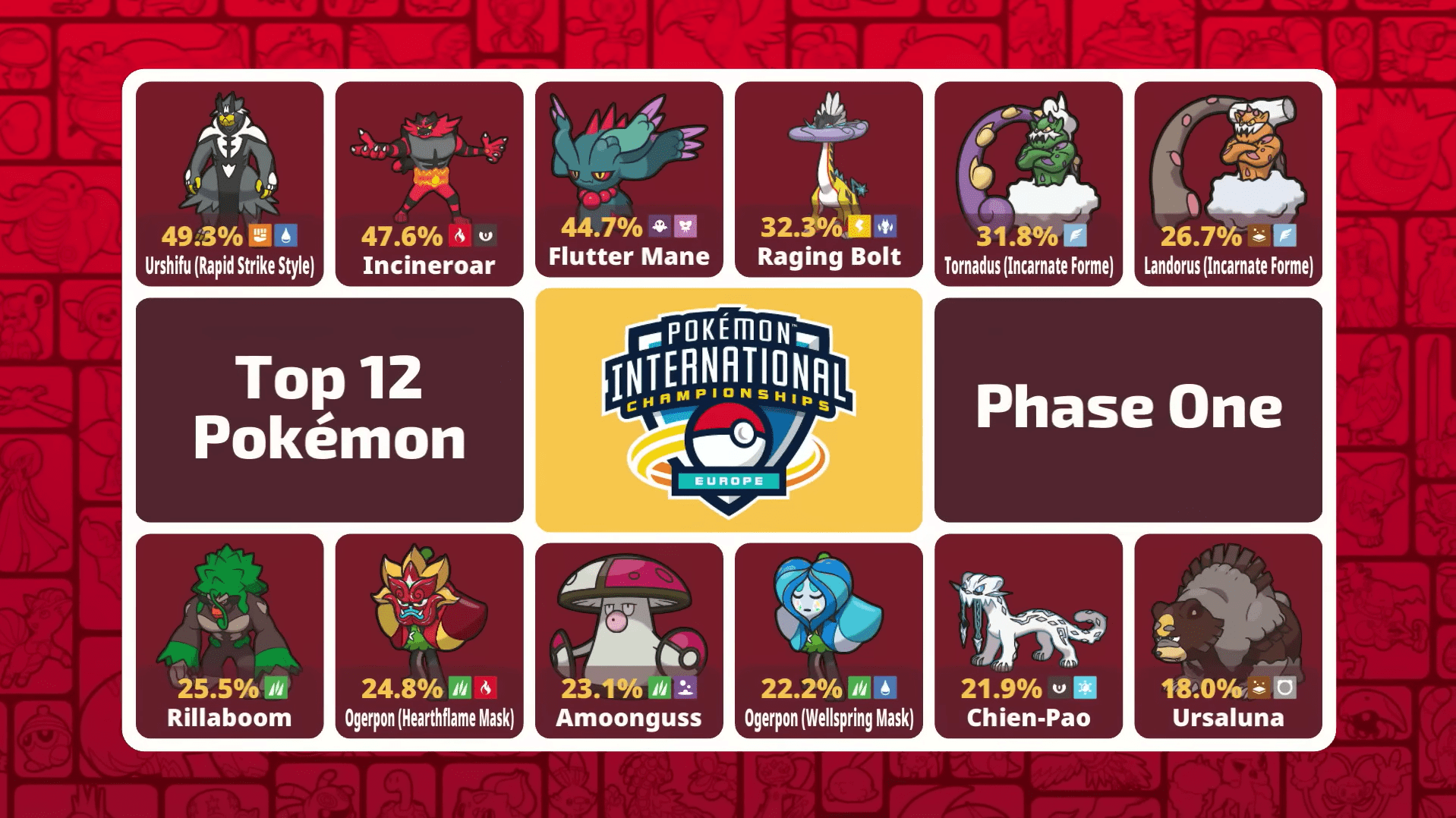 Nella fase iniziale del torneo, il metagame ha mostrato una notevole eterogeneità, pur ricordandoci dei Pokèmon presenti in praticamente qualsiasi squadra. Urshifu Pluricolpo ha guidato la classifica con il 49,3%, mentre Incineroar ha aperto la competizione con uno usage del 47,6%, confermandosi il supporto più ricercato. Crinealato si è attestato al 44,7%, dimostrando di essere il Pokémon Paradosso di riferimento per quasi metà dei partecipanti, seguito da Furiatonante con un 32,3%. In questa fase, la varietà di archetipi è stata garantita dalla presenza massiccia di Tornadus (31,8%) e diverse varianti di Ogerpon, con la Maschera Focolare al 24,8% e la Maschera Pozzo al 22,2%. Nel resto della classifica troviamo attaccanti versatili come Landorus al 26,7%, Chien-Pao al 21,9% e Ursaluna al 18%, e come supporto abbiamo gli intramontabili Rillaboom, 25,5%, e Amoonguss, 23,1%.