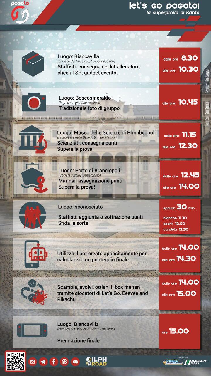 - Iniziative: Let’s Go PoGOTo – Il Parco del Valentino si trasformerà nella regione di Kanto in occasione del Community Day. Dalle 8.30 alle 10.30 ci si potrà iscrivere gratuitamente alla Super Prova a punti che permetterà di vincere tante Pokémonete, dei giochi per Nintendo Switch (grazie alla collaborazione con Pokémon Millennium) e una console Nintendo Switch (grazie alla collaborazione con Madison Mark).