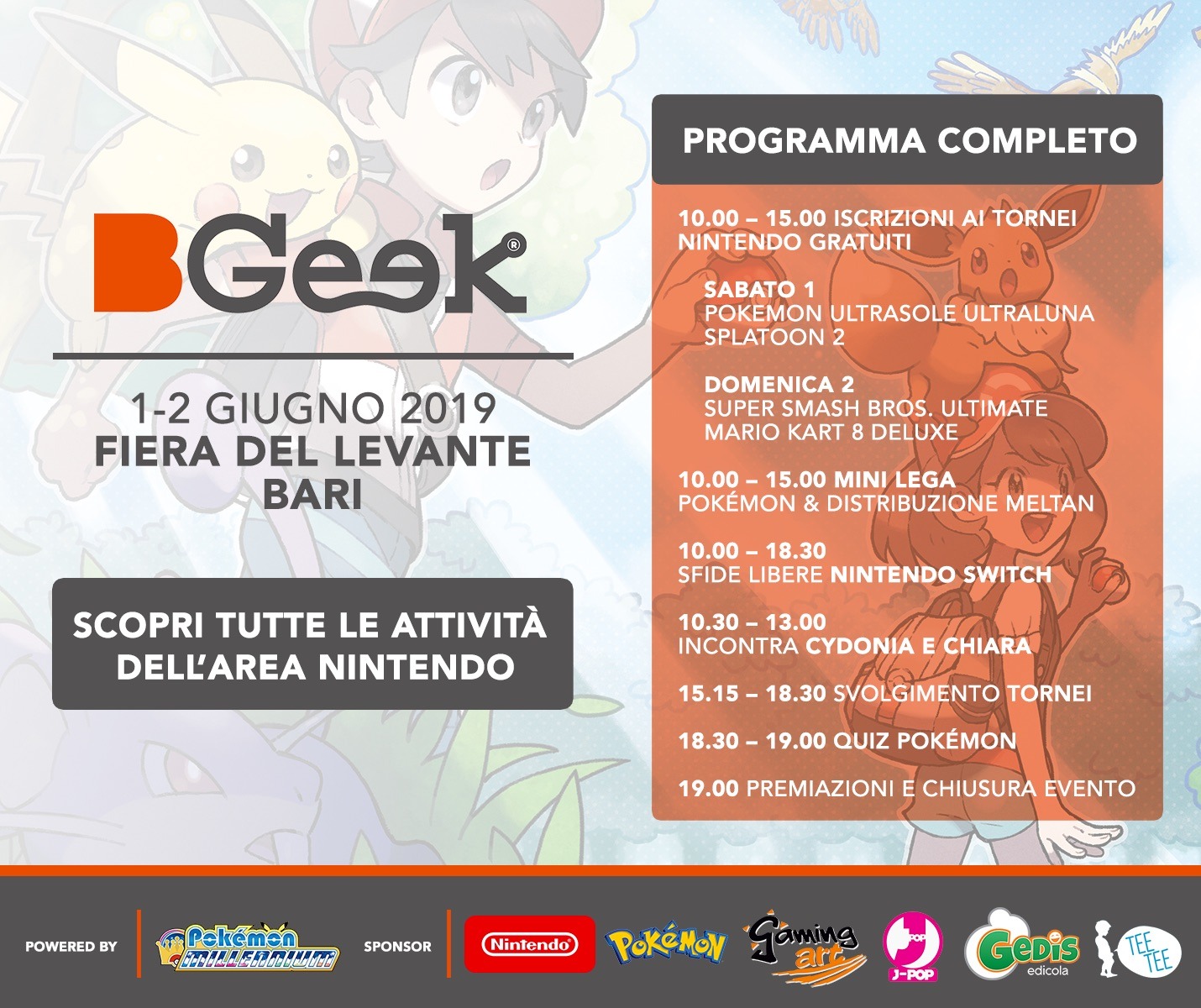 Il mondo Nintendo colorerà la splendida città di Bari in occasione di BGeek, l’atteso festival dell’immaginazione si terrà l’1 e 2 giugno 2019 presso la Fiera del Levante. Pokémon Millennium allestirà un’area Nintendo dove i fan di tutte le età potranno prendere parte a tante attività e tornei gratuiti, vincere un sacco di premi, ricevere esclusivi gadget Nintendo e incontrare Cydonia e Chiara!